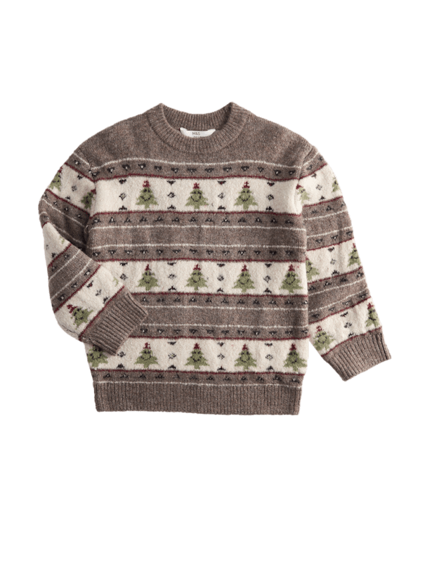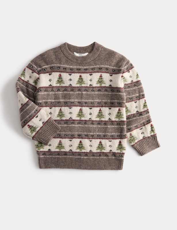 Keep them cosy on festive days with this charming Christmas jumper. It's knitted in a regular fit with a crew neckline and added stretch for comfort. The Fair Isle-inspired design features smiling Christmas trees for a fun look.