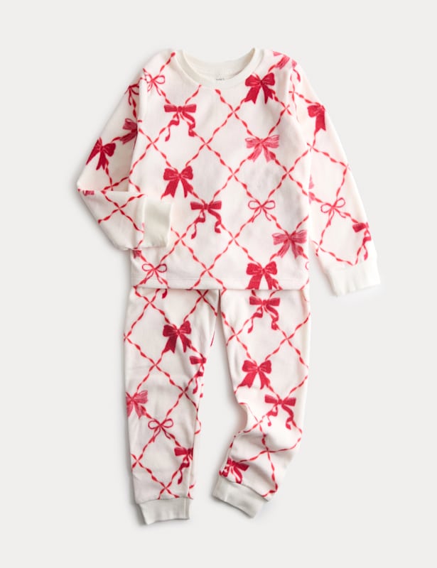 These festive pyjamas are a sweet addition to their nightwear collection. Two-piece set, cut in a comfy regular fit. Includes a long-sleeved top with a pretty bow graphic and full-length bottoms to match. Cuffs at the wrists and ankles help seal in body heat.