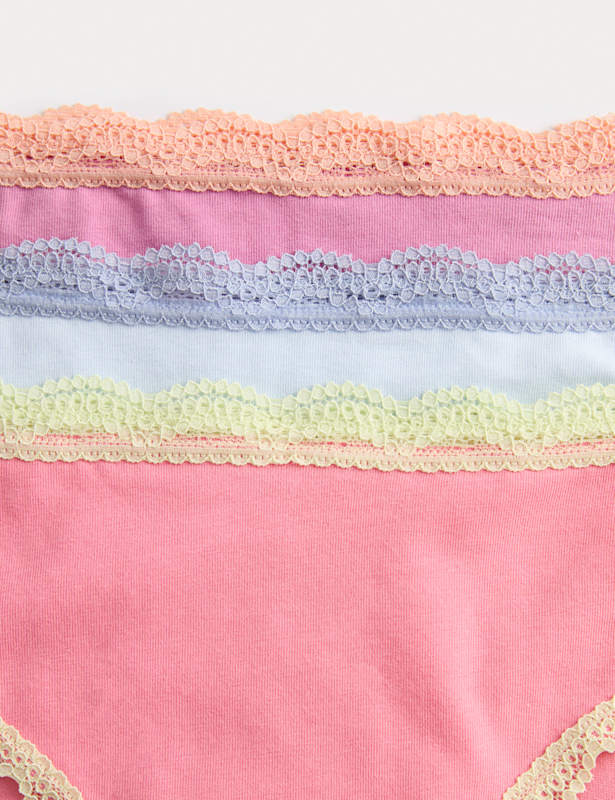 Cotton-rich fabric ensures these knickers feel soft and breathable against the skin. Low-rise Brazilian style, with lace trims. Pack comprises two plain pairs and one striped design. M&S Collection: versatile styles in modern shapes with unique and playful details.