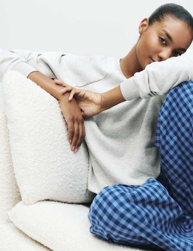 This supersoft cotton-rich pyjama set pairs a cosy sweatshirt with checked bottoms for a relaxed look. Regular fit. The trousers feature an easy elasticated waist. M&S Collection: versatile styles in modern shapes with unique and playful details.