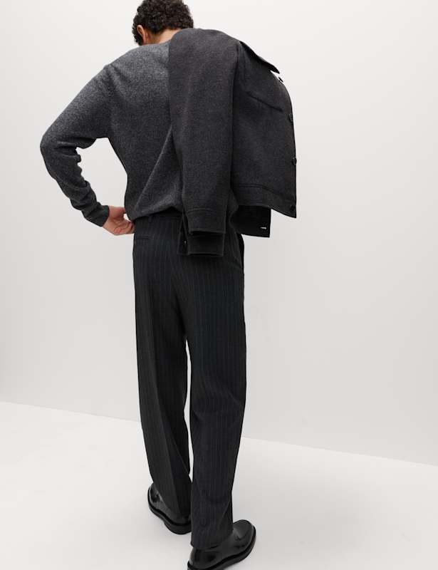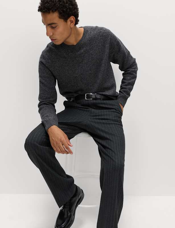 These pinstripe trousers are made from warm handle fabric for a cosy feel. They're cut in a roomy relaxed fit with a neat flat front. Added stretch offers easy movement, while a hook bar and zip fastening ensures a secure finish. M&S Collection: easy-to-wear wardrobe staples that combine classic and contemporary styles.