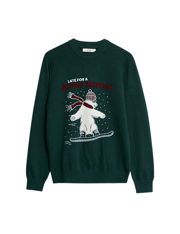 Get into the festive spirit with this Christmas jumper. Made in a regular fit from breathable pure cotton. Design shows a snowboarding polar bear who's late for his 'board meeting'. M&S Collection: easy-to-wear wardrobe staples that combine classic and contemporary styles.