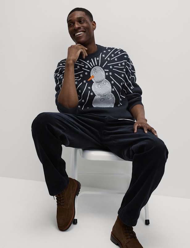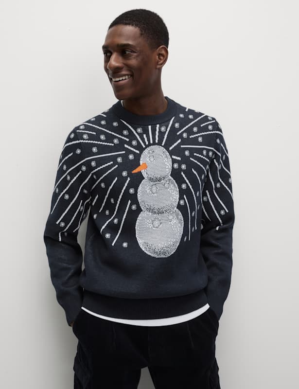 Get into the festive spirit in eye-catching style with this Christmas jumper, which is decorated with a dynamic snowman-in-a-snowstorm motif. It's made from soft pure cotton for comfort and breathability. Laid-back crew neck and snug-fitting ribbed trims. M&S Collection: easy-to-wear wardrobe staples that combine classic and contemporary styles.