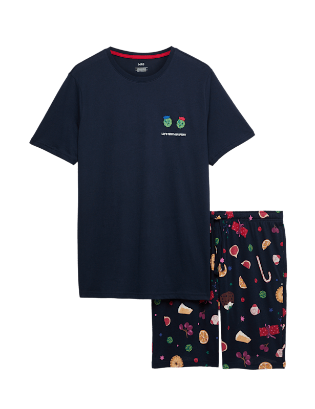 Get into the Christmas spirit with these fun pure cotton pyjamas. Comfy regular fit. Short-sleeved top has festive sprouts with slogan 'Twist and sprout' on the chest. Shorts feature an all-over print with figs, mince pies and candy canes, and have a comfy drawstring waist and handy side pockets. M&S Collection: easy-to-wear wardrobe staples that combine classic and contemporary styles.