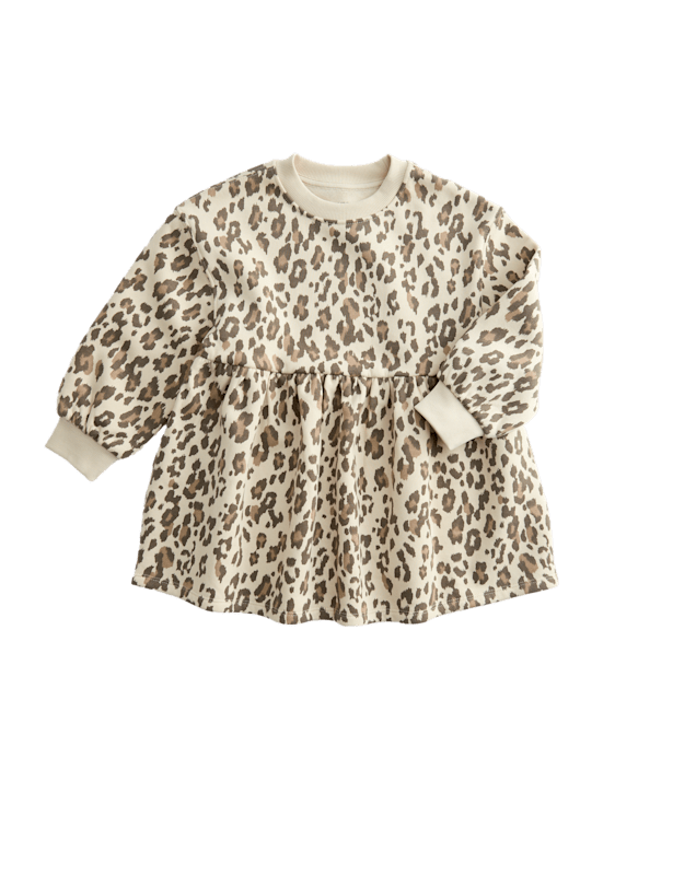 Wth its substantial cotton-rich fabric, this sweatshirt dress is a snug choice for your little one. Classic regular fit, with ribbed trims at the long sleeves and a round neckline. An all-over leopard print adds a fun finish.