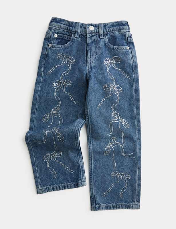 These pure cotton denim jeans are a practical addition to their wardrobe. Comfy regular fit, with a button and zip fastening at the elasticated waistline. A diamanté bow pattern down the front of each leg adds plenty of sparkle.