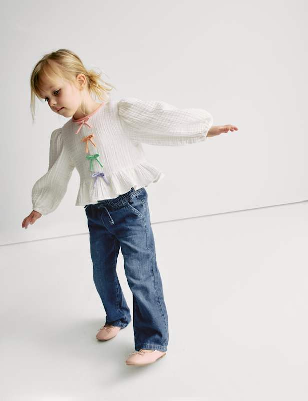 These pure cotton denim jeans are a comfy choice for casual days. They're cut in a wide-leg fit, with an elasticated drawstring waist for easy wear. Subtle fading on the legs creates an authentic finish.