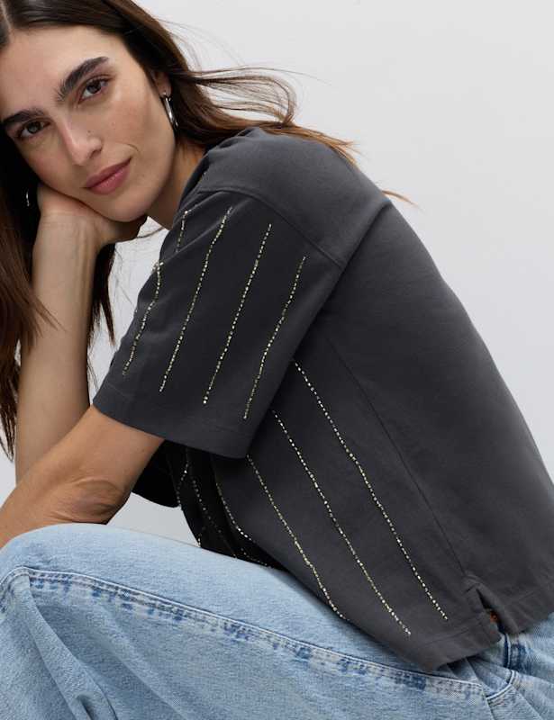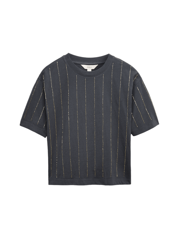 Metallic embellishments add a touch of sparkle to this pure cotton t-shirt. It's designed in a regular fit, with short sleeves and a slightly boxy shape. The piece is complete with a timeless crew neckline. M&S Collection: easy-to-wear wardrobe staples that combine classic and contemporary styles.