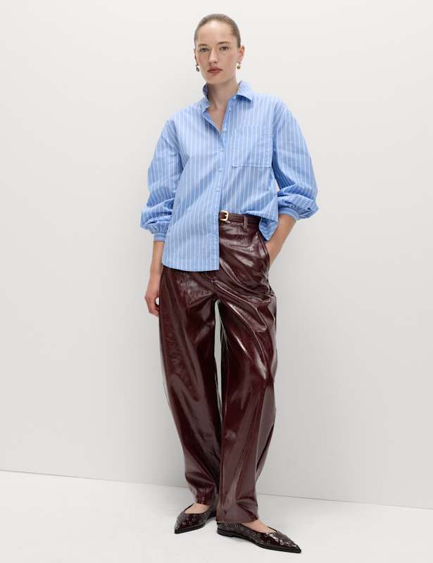 Amp up smart or casual outfits with these leather-look trousers. They're designed in an on-trend barrel shape with a flattering high-rise waist. The textured high shine finish adds extra style points, while two side pockets offer practicality. This style is complete with a neat zip and button closure. M&S Collection: easy-to-wear wardrobe staples that combine classic and contemporary styles.