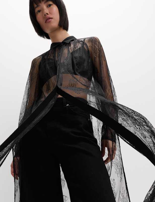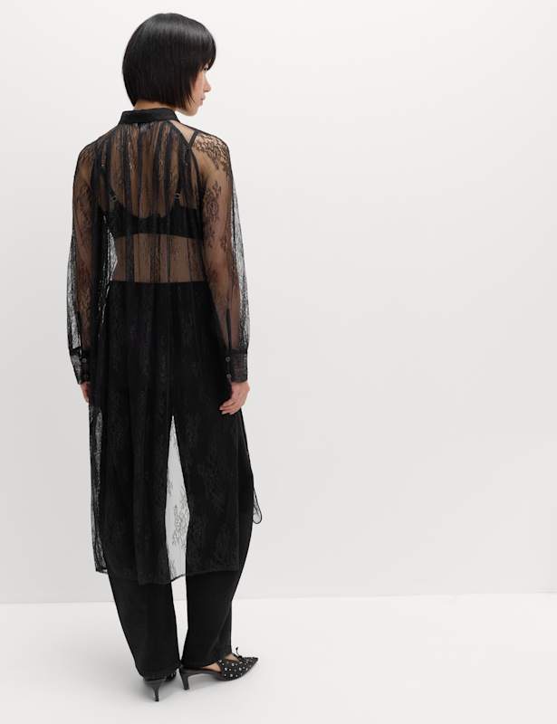 Delicate lace brings a feminine feel to this longline shirt. It's designed in an easy regular fit, with a smart collared neckline and long sleeves. The button-through front allows versatile wear, either fastened up or open over a cami. M&S Collection: easy-to-wear wardrobe staples that combine classic and contemporary styles.