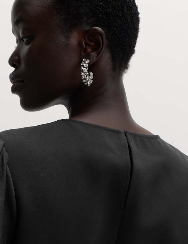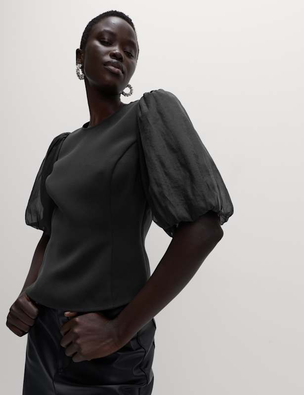 This top was made for party season. It's cut to a flattering fitted, waisted shape from opulent organza. Puffed three-quarter sleeves create a statement silhouette, while the keyhole button fastening on the back of the crew neck adds feminine detail. M&S Collection: easy-to-wear wardrobe staples that combine classic and contemporary styles.