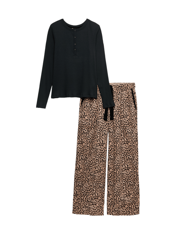 These pyjamas are made from a lightweight and breathable cotton-blend fabric with added stretch. Regular fit set, comprising a ribbed Henley top. The full-length bottoms have a leopard print and an elasticated drawcord waist. M&S Collection: versatile styles in modern shapes with unique and playful details.