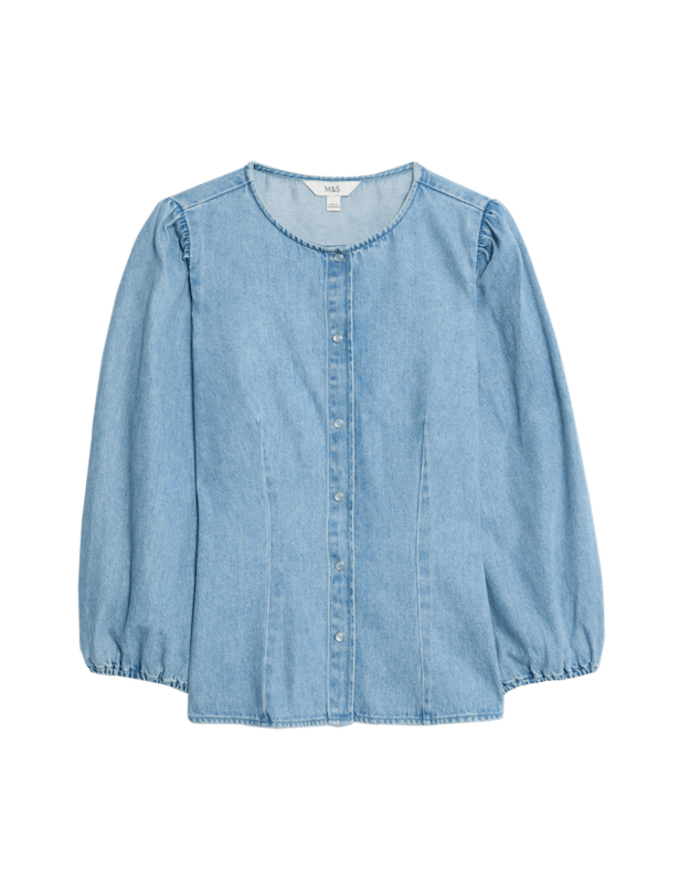 This cotton-rich denim blouse is a versatile addition to your wardrobe. It's designed in an easy regular fit, with a neat crew neckline and button-through fastening. The long puff sleeves add a touch of volume. M&S Collection: easy-to-wear wardrobe staples that combine classic and contemporary styles.