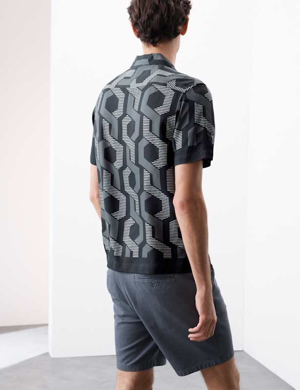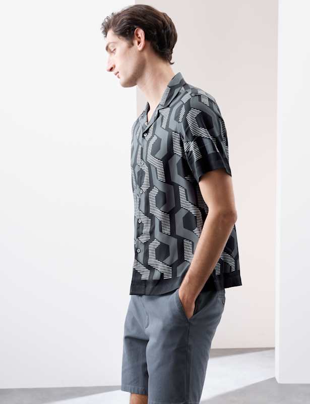 This lightweight shirt makes a statement with its powerful geometric print. Cut to a regular fit with a relaxed Cuban collar, it balances sharp style with comfort. Short sleeves and a discreet button-through fastening create an effortless silhouette, while the soft fabric ensures a comfortable feel.Autograph: Premium investment pieces featuring contemporary cuts and refined finishing touches.